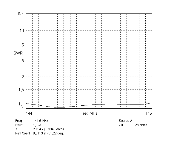 Cable balun To match the 28 Ohm intrinsic resistance of the yagi to 50 Ohm coax impedence a l/4 coax balun is used. Two l/4 long pieces of 75 Ohm TV/Sat cable (pay attention to velocity factor) in parallel resulting in a 37.5 Ohm balun. Before you connect the balun first measure the VSWR connecting a dummy load of metaloxid resistors (low inductance !) of 2 x 56 Ohm/2W or 8 x 220 Ohm/2W in parallel for a perfect load of your TX. You should get a VSWR of 1:1 (almost). The velocity factor maybe isn't given reliably so you have to test it out. See different 75 Ohm cables (left to right): sat cable (thin braid); RG-59; sat cable (good quality); Belden H125CH (good quality, dense braid); very good sat cable (dense braid, choosen for the above antenna); RG-179 3mm teflon cable, very good quality but quite expensive (up to ~300W on 2m and ~200W on 70cm only ! ). Final tuning If you measured the the cable balun exactly the only factor for correcting the resonant frequency is the lenght of the straight, split dipole. It is likely to be too long so maybe you need to shorten it due to additional inductance of the ring lugs and the cable connections. [1] Fa. Konni Antennentechnik, D- 97839 Esselbach, www.konni-antennen.de